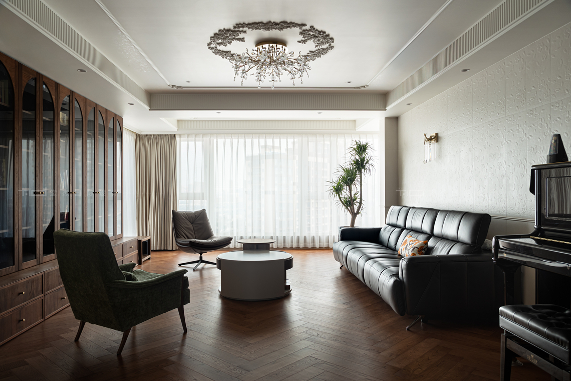 中古风格在此处诠释为“新中式”的延伸,既保留东方意蕴,又突破传统对称框架。通过抽象化手法解构经典元素,如以现代几何线条演绎窗棂纹样,或通过水墨意境壁画替代传统字画,实现视觉语言的创新 。空间布局强调流动性与开放性,弱化隔断,利用家具组合自然划分功能区域,契合大平层开阔通透的优势。