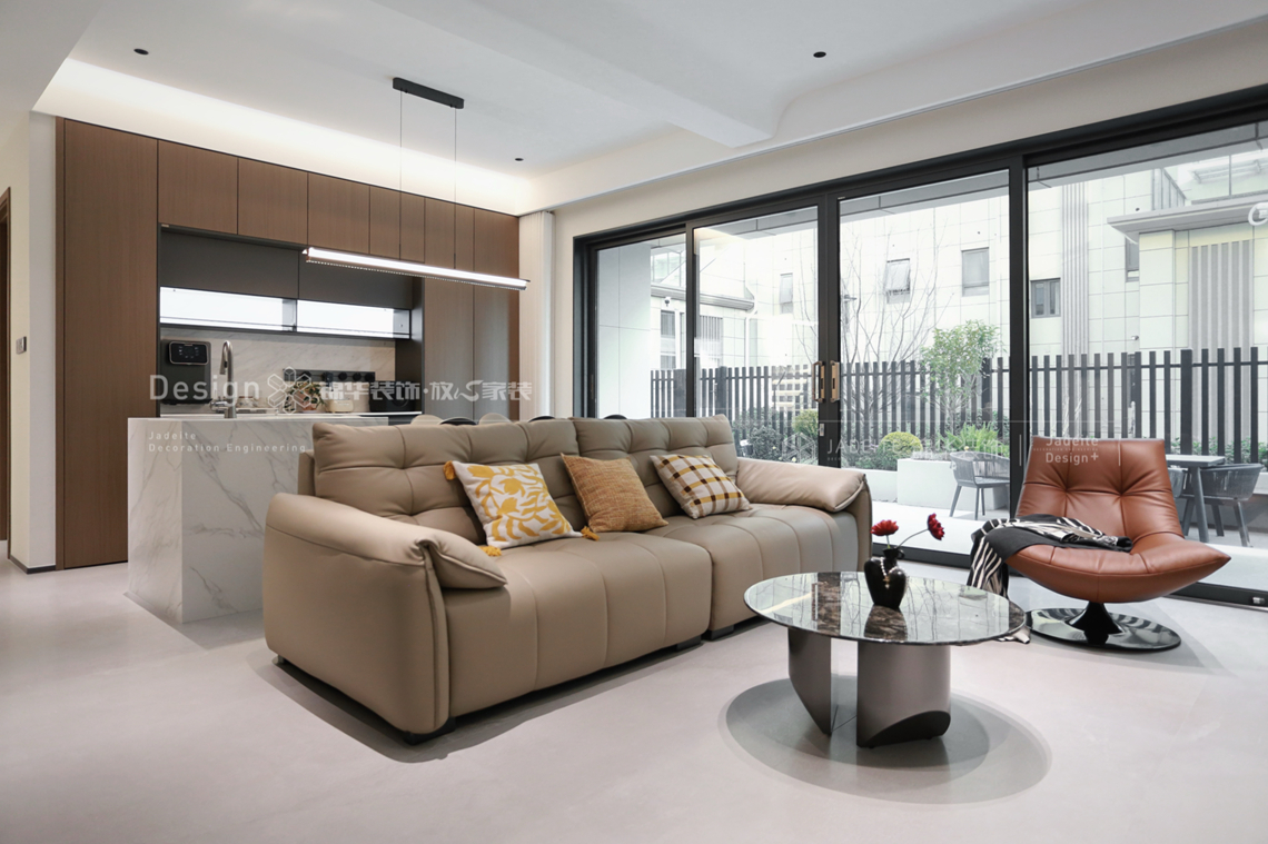 主色调选用大地色系与高级灰的和谐对话,沙色、陶土色与岩石灰构成空间基调。金属元素以香槟金、 brushed brass(拉丝黄铜)的温和光泽悄然提升质感层次。卡拉拉大理石纹理如流动的诗篇,实木元素保留自然肌理与温度。家具线条干净利落,摒弃冗余装饰,以恰到好处的弧度软化空间。隐藏式线性灯光勾勒结构,设计感吊灯成为视觉焦点,充分利用自然光,搭配可调节百叶,让光影随时间舞蹈,重点照明突出艺术陈列,营造美术馆般的观赏体验。整墙收纳系统隐藏于简约墙面之后,功能与美学无缝衔接。半开放式厨房与餐厅形成互动岛台,社交烹饪两相宜。主卧延续舒缓色调,床头木饰面墙面提供视觉温暖,步入式衣帽间功能分区智能合理,全屋定制系统确保每一寸空间都恰到好处。